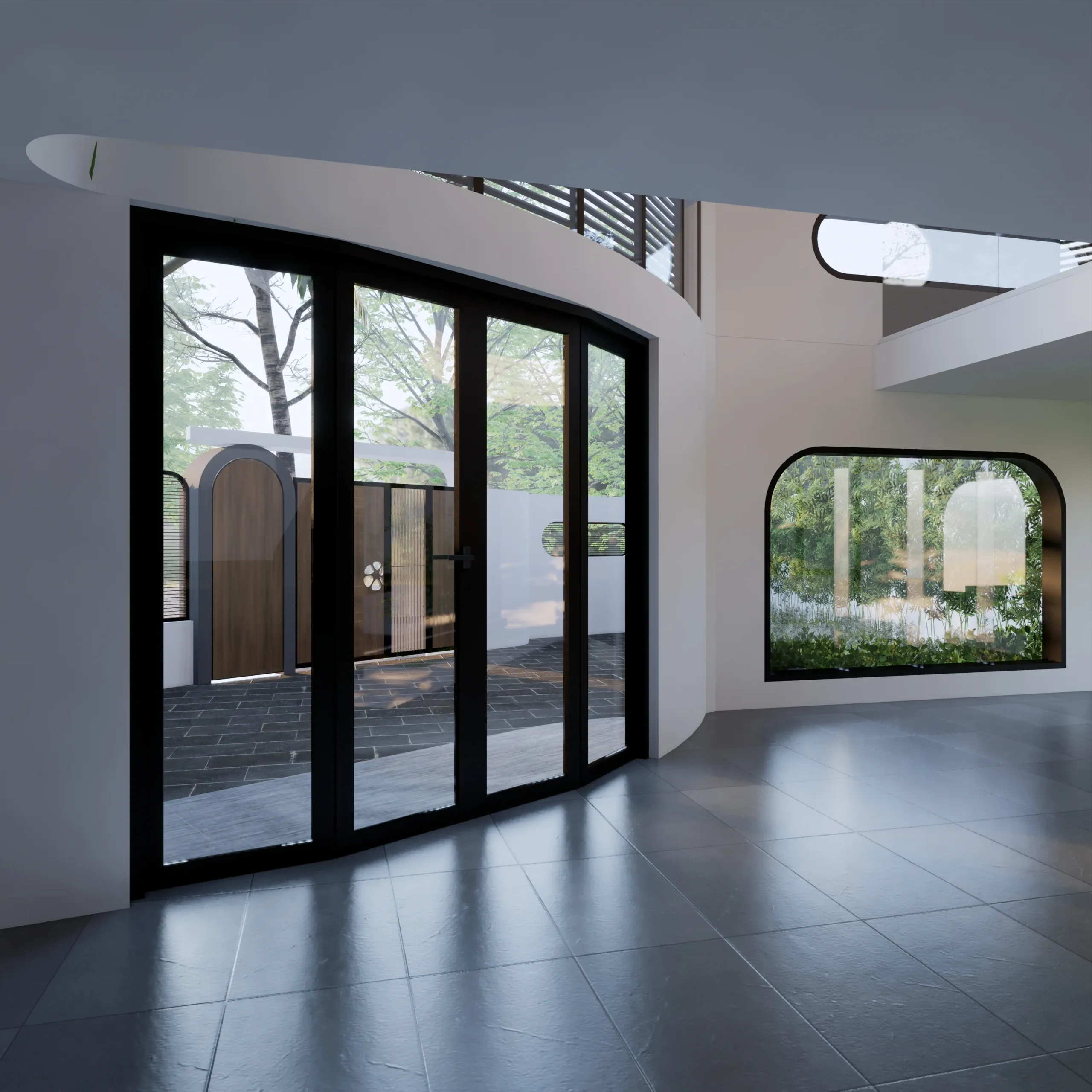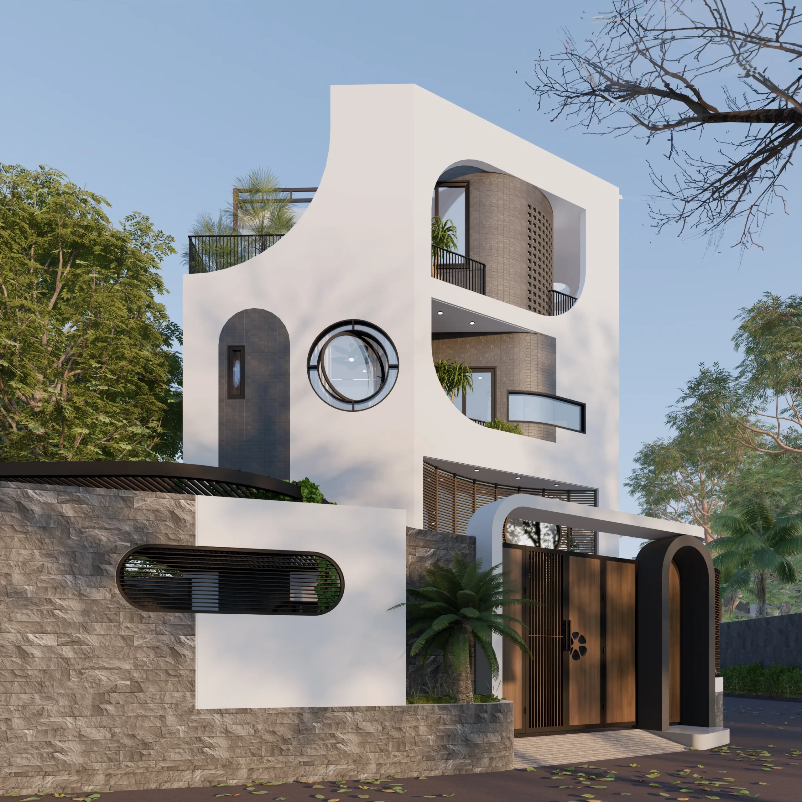 Gam màu trung tính chủ đạo kết hợp cùng vật liệu gỗ, đá và kính giúp công trình vừa hiện đại, vừa gần gũi. Cách xử lý mảng đặc – rỗng, cửa sổ tròn và ban công cong không chỉ tạo điểm nhấn thị giác mà còn đảm bảo sự riêng tư và chiều sâu cho mặt tiền biệt thự.